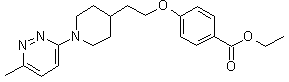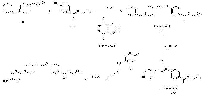 The condensation of 2-(1-benzylpiperidin-4-yl)ethanol (I) with 4-hydroxybenzoic acid ethyl ester (II) by means of triphenylphosphine and diazenedicarboxylic acid diethyl ester in THF gives 4-[2-(1-benzylpiperidin-4-yl)ethoxy]benzoic acid ethyl ester (III) as fumarate salt. This compound is debenzylated by hydrogenation with H2 over Pd/C in ethanol, yielding the free product (IV), which is finally condensed with 3-chloro-6-methylpyridazine (V) by means of K2CO3 in DMF.
