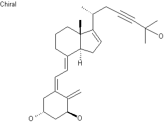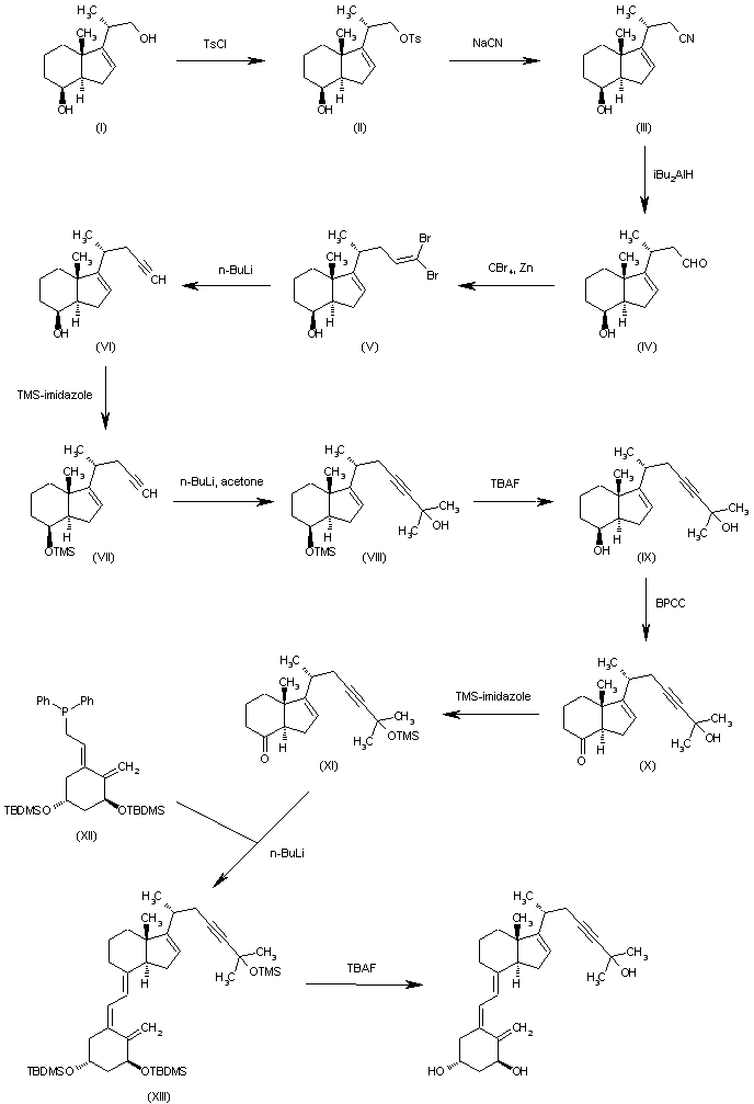 The tosylation of the primary alcohol of the hexahydroindenepropanol (I) with TsCl in pyridine gives the tosylate (II), which is treated with NaCN in DMSO to yield the butyronitrile (II). The reduction of (III) with diisobutylaluminum hydride in dichloromethane affords the butyraldehyde (IV), which is condensed with CBr4 by means of Zn in dichloromethane providing the 1,1-dibromo-1-pentene derivative (V). The dehydrobromination of (V) with n-BuLi in THF/hexane affords the 1-pentyne derivative (VI), which is treated with 1-(trimethylsilyl)imidazole to give the silyl ether (VII). The condensation of (VII) with acetone by means of n-BuLi in THF yields the 3-heptyn-2-ol derivative (VIII), which is desilylated with TBAF in THF affording the diol (IX). The oxidation of the secondary alcohol of (IX) with bipyridinium chlorochromate (BPCC) in dichloromethane provides the corresponding ketone (X), which is protected at the tertiary alcohol with 1-(trimethylsilyl)imidazole giving the silylated ketone (XI). The condensation of (XI) with the phosphorane (XII) by means of n-BuLi in THF yields the protected intermediate (XIII), which is finally deprotected with TBAF in THF.
