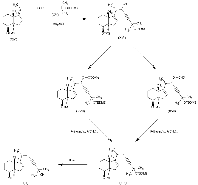 Alternatively, the intermediate diol (IX) has been obtained as follows: The condensation of perhydroindene derivative (XIV) with the acetylenic aldehyde (XV) by means of Me3AlCl gives the acetylenic alcohol (XVI), which is esterified to the formate (XVII) or the carbonate (XVIII). The deoxygenation of (XVII) or (XVIII) by means of Pd(acac)2 and P(CH3)3 in hot toluene affords the silylated diol (XIX), which is submitted to desilylation with TBAF to afford the target diol intermediate (IX).