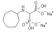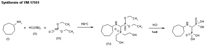 The reaction of cycloheptylamine (I) with triethyl orthoformate (II) and diethyl phosphite (III) at 150 gives cycloheptylaminomethylenediphosphonic acid tetraethyl ester (IV), which is then hydrolyzed with refluxing concentrated hydrochloric acid.