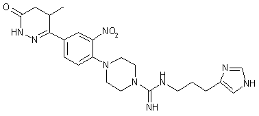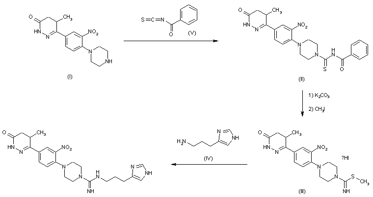 The acylation of 5-methyl-6-[3-nitro-4-(piperazin-1-yl)phenyl]-4,5-dihydro-3(2H)-pyridazinone (I) with benzoyl isothiocyanate gives the benzoylthiourea (II), which is cleaved by alkaline hydrolysis with potassium carbonate and methylated with methyl iodide to the isothiouronium salt (III). This compound is condensed with 3-(1H-imidazol-4-yl)propylamine (homohistamine, IV) to yield title compound.