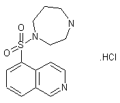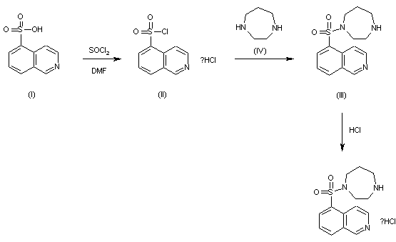 5-Isoquinolinesulfonic acid (I) is heated at 85 C with SOCl2 and DMF yielding 5-isoquinolinesulfonyl chloride hydrochloride (II). The reaction of (II) with hexahydro-1H-1,4-diazepine affords hexahydro-1-(5-isoquinolinesulfonyl)-1H-1,4-diazepine (III) in CH2Cl2. Finally, the reaction of (III) with HCl gives hexahydro-1-(5-isoquinolinesulfonyl)-1H-1,4-diazepine hydrochloride (IV). (scheme 10964901a)