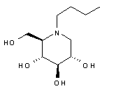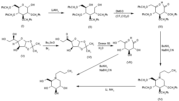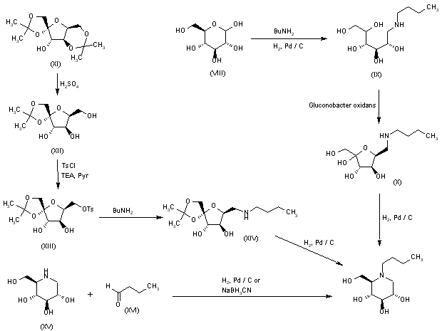 3) The reductocondensation of D-glucose (VIII) and butylamine by means of H2 over Pd/C in ethanol gives N-butylglucamine (IX), which is submitted to a biochemical oxidation by means of Gluconobacter oxidans in water to yield 6-(butylamino)-6-deoxy-a-L-sorbofuranose (X). Finally, this compound is submitted to a reductive cyclization with H2 over Pd/C in ethanol/water. 4) The selective hydrolysis of 1,2:4,6-di-O-isopropylidene-a-L-sorbofuranose (XI) (together with some of its 1,3:4,6-isomer) by means of H2SO4 in methanol gives 1,2-O-isopropylidene-a-L-sorbofuranose (XII), which is treated with tosyl chloride, triethylamine and pyridine to yield the monotosylated sugar (XIII). Reaction of the protected sugar (XIII) with butylamine in hot pyridine/triethylamine affords 6-(butylamino)-6-deoxy-1,2-O-isopropylidene-a-L-sorbofuranose (XIV), which is finally submitted to a reductive cyclization by means of H2 over Pd/C in water. 5) Directly by reductocondensation of 1-deoxynojiri-mycin (XV) with butyraldehyde (XVI) by means of H2 over Pd/C in methanol or with NaBH3CN in methanol/ HCl.