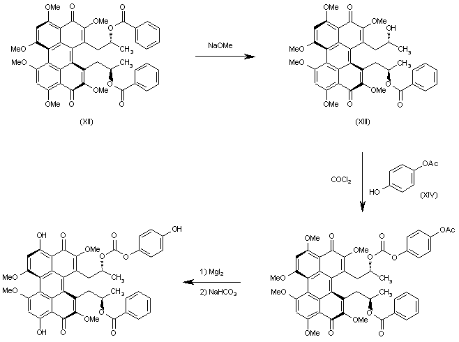 Compound (XII) is selectively debenzoylated with sodium methoxide in methanol yielding the monobenzoyl ester (XIII). The acylation of (XIII) with phosgene, triethylamine and monoacetyl hydroquinone (XIV) affords the carbonate ester (XV), which is selectively demethylated with MgI2 and deacetylated with NaHCO3 to afford the target Calpostin C.