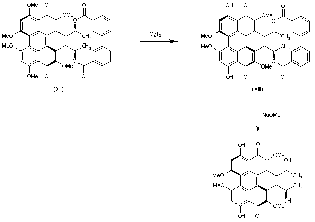 Intermediate (XII) is selectively demethylated with MgI2 to afford Calpostin A (XIII). Finally, this compound is debenzoylated with NaOMe in methanol to give Calpostin D.