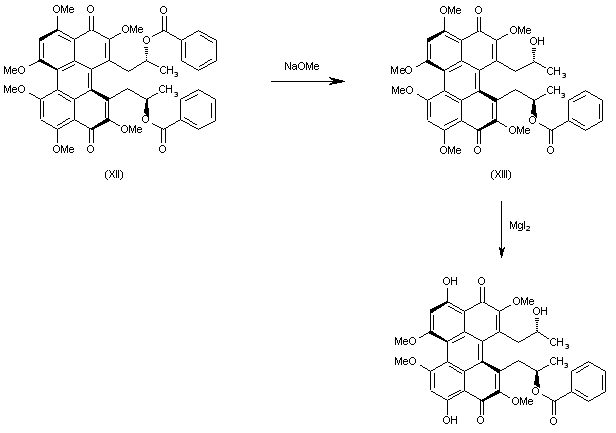 Compound (XII) is selectively debenzoylated with sodium methoxide in methanol yielding the monobenzoyl ester (XIII). Finally, this compound is selectively demethylated with MgI2 to afford the target Calpostin B.