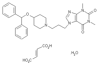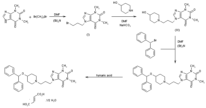 Reaction of theophylline (I) with 1,3-dibromopropane (II) in DMF in the presence of triethylamine afforded the bromo intermediate (III)) in 77% yield. Reaction of (III) with 4-hydroxypiperidine (IV) in DMF in the presence of sodium bicarbonate afforded the unsubstituted hydroxypiperidinyl intermediate (V) in 31% yield which was subsequently alkylated with diphenylmethylbromide (VI) to afford Wy-49,051 in 29% yield.