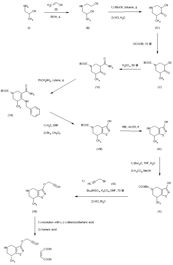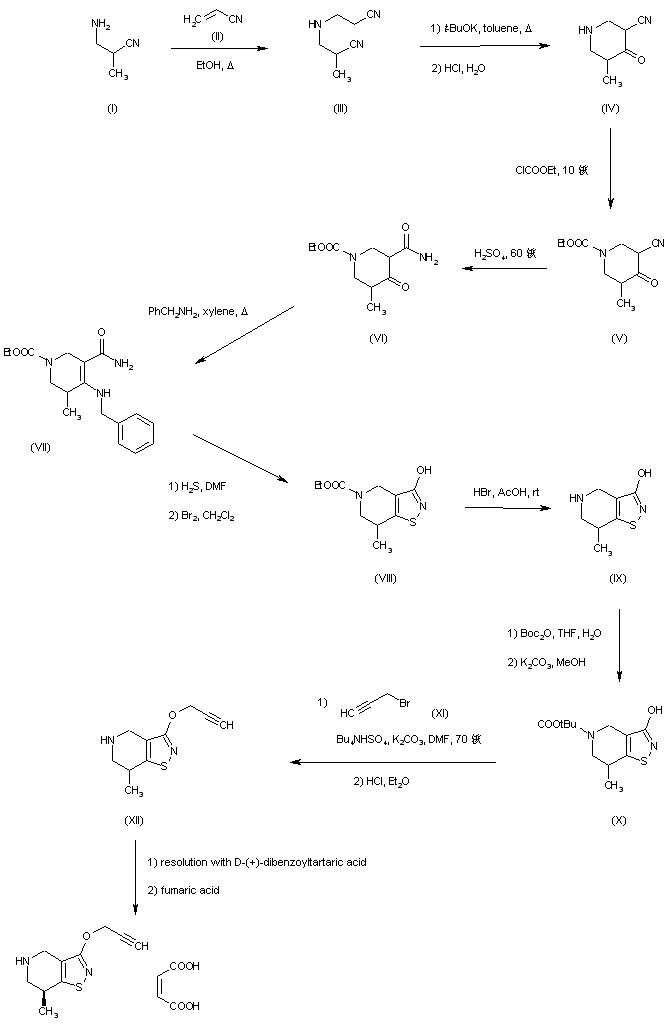 Michael addition of acrylonitrile (II) to 2-methyl-3-aminopropionitrile (I) gave dinitrile (III), which was cyclized to piperidone (IV) under Thorpe-Ziegler conditions. After protection of (IV) as the carbamate (V), hydrolysis of the nitrile with 85% H2SO4 provided ketoamide (VI). This was converted to enamine (VII) by condensation with benzylamine in refluxing xylene. Subsequent treatment of (VII) with H2S in DMF, followed by bromine in AcOH furnished isothiazole (VIII). The ethoxycarbonyl group of (VIII) was then replaced for a tert-butoxycarbonyl group by hydrolysis with HBr in AcOH to (IX), and then reaction with Boc2O to give a N,O-di-Boc intermediate, which was further treated with K2CO3 in MeOH to afford (X). After alkylation of the hydroxyl group of (X) with propargyl bromide (XI), the tert-butyl carbamate was removed with ethereal HCl to yield the racemic isothiazolopyridine (XII). Finally, the (S)-(+)-enantiomer of (XII) was resolved by crystallization as the diastereomeric salt with D-(+)-dibenzoyltartaric acid and, after liberation of the base with NaOH, was isolated as the fumarate salt.