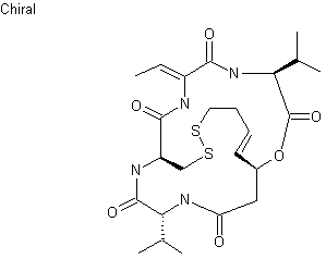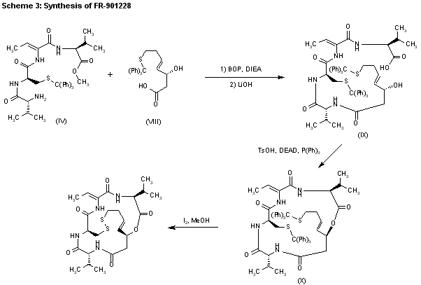 (iii) An intramolecular oxidative coupling of the thiols to form a 15-membered disulfide-containing ring: To complete the synthesis of FR901228, the beta-hydroxymercaptoheptenoic acid (VIII) was coupled to the 16-membered cyclic depsipeptide (IV) using the BOP reagent, followed by LiOH-mediated hydrolysis, resulting in the free acid product (IX). Cyclization of the hydroxy acid (IX) with TsOH, DEAD and PPh3 and oxidation of the bis(S-triphenylmethyl)lactone (X) with iodine in methanol solution yielded the depsipeptide FR901228.