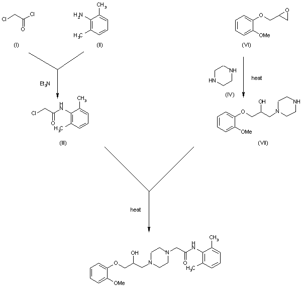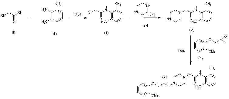 1) The acylation of 2,6-dimethylaniline (II) with chloroacetyl chloride by means of triethylamine in dichloromethane gives N-(2,6-dimethylphenyl) chloroacetamide (III), which is condensed with piperidine (IV) in refluxing ethanol to yield N-(2,6-dimethylphenyl)-2-piperazinoacetamide IV). Finally, this compound is condensed with 3-(2-methoxyphenoxy)-12-epoxypropane (VI) in refluxing methanol toluene.