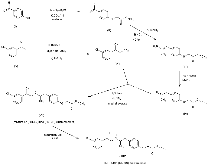 BRL 35135 may be obtained by the following synthetic procedures: Alkylation of 4-hydroxybenzaldehyde (I) with methyl chloroacetate in boiling acetone in the presence of potassium carbonate and a catalytic quantity of potassium iodide gives methyl 4-formylphenoxyacetate (II), which is condensed with nitroethane in glacial acetic acid in the presence of n-butylamine to give the nitrostyrene (III). Reduction of nitrostyrene (III) with steel wool and glacial acetic acid/methanol leads to methyl 4-(2-oxopropyl)phenoxyacetate (IV). Condensation of (IV) with alpha-(aminomethyl-3-chlorobenzenemethanol (VI) and hydrogenation of the resultant imine with platinum in methyl acetate leads to a mixture of diastereomers (VII). Pure BRL 35135 can be obtained from this mixture of diastereomers by fractional crystallization, and subsequent recrystallization, of the hydrobromide salt from methyl acetate-methanol. The ethanolamine (VI) is prepared by addition of trimethylsilyl cyanide to 3-chlorobenzaldehyde (V) in diethyl ether in the presence of a catalytic amount of zinc iodide and subsequent reduction of the trimethylsilylcyanohydrin with lithium aluminum hydride.