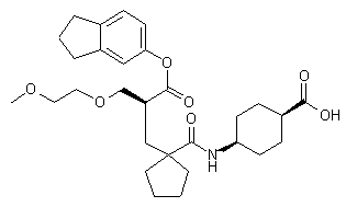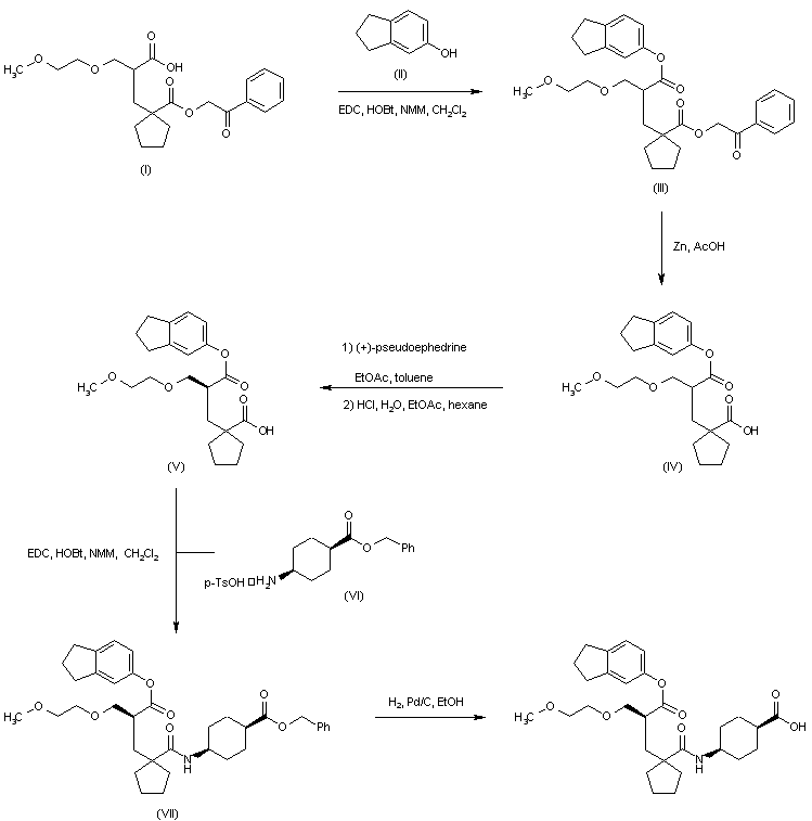 The known 2-(2-methoxyethoxymethyl)-3-[1-(phenacyloxycarbonyl)cyclopentyl]propanoic acid (I) was esterified with 5-indanol (II) by using EDC and HOBt to afford the indanyl ester (III). The phenacyl ester group was then reductively cleaved with Zn in HOAc to yield the racemic carboxylic acid (IV). Resolution of (IV) by means of (+)-pseudoephedrine provided the (S)-enantiomer (V). The chiral acid (V) was then coupled with benzyl cis-4-amino-1-cyclohexancarboxylate (VI) in the presence of EDC and HOBt to furnish amide (VII). The benzyl ester group of (VII) was finally cleaved by hydrogenolysis over Pd/C to give the title compound.