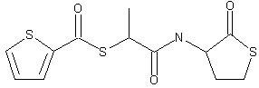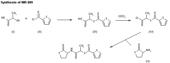 Triethylamine is added to thiolactic acid (I) and 2-thiophencarbonyl chloride (II) in tetrahydrofuran. Mix is cooled at -5 C under agitation and thionyl chloride is added keeping the temperature between 0 and 10 C. A solution of homocysteine thiolactone hydrochloride and triethylamine in water is then added to the reaction, keeping the temperature below 10 C. The reaction is carried out for 1 h at room temperature under agitation, after which the solvent is evaporated at reduced pressure. Water is used to wash and diethyl ether to extract. The organic phase is dried on Na2SO4 anhydrous and the solvent is eliminated at reduced pressure. The raw product obtained from a mix of dichloromethane/diethyl ether (60/40) is crystallized (MR-889).