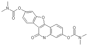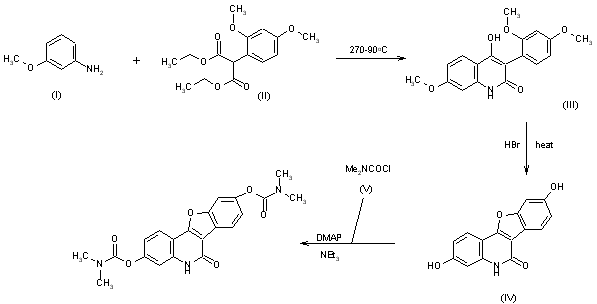 The cyclization of m-anisidine (I) with 2,4-dimethoxyphenylmalonic acid diethyl ester (II) in refluxing diphenyl ether (270-90 C) gives 3-(2,4-dimethoxyphenyl)-4-hydroxy-7-methoxyquinolin-2-(1H)-one (III), which is submitted to a new cyclization process in refluxing 47% aqueous HBr yielding 3,9-dihydroxybenzofuro[3,2-c]quinolin-6-(5H)-one (IV). Finally, this compound is esterified with N,N-dimethylcarbamoyl chloride (V) by means of triethylamine and dimethylaminopyridine (DMAP) in DMF.