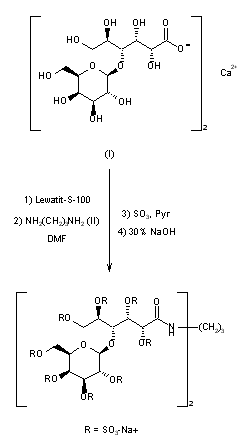 One-pot reaction of calcium lactobionate (calcium 4-O-beta-D-galactopyranosyl-D-gluconate) (I) with Lewatit S1010, 1,3-diaminopropane (II) in dimethylformamide, SO3-pyridine complex and aqueous sodium hydroxide.