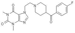 The condensation of 7-(2-chloroethyl)theophylline (I) with 4-(p-fluorobenzoyl)piperidine (II) gives flufylline.
