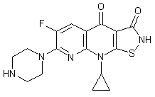 The condensation of 2-(2,4,5-trifluorobenzoyl)acetic acid ethyl ester (I) with cyclopropyl isothiocyanate (II) by means of NaH in DMF gives the sodium salt (IIIa-b), which is methylated with methyl iodide to afford the methylsulfanyl derivative (IVa-b). The cyclization of (IVa-b) by means of NaH in THF provides the methylsulfanyl quinolone (V), which is oxidized with MCPBA to the corresponding methylsulfinyl compound (VI). The reaction of (VI) with NaSH in THF furnishes 1-cyclopropyl-6,7-difluoro-4-oxo-2-sulfanyl-1,4-dihydroquinoline-3-carboxylic acid ethyl ester (VII), which is cyclized with hydroxylamine-O-sulfonic acid and NaHCO3 through the intermediate (VIII), affording the isothiazoloquinoline (IX). Finally, this compound is condensed with piperazine (X) in pyridine to give the target compound.