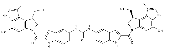 The reaction of indoline (I) with propynoic acid methyl ester (II) in methanol gives the acrylic acid derivative (III), which is cyclized by means of Pd(OAc)2 in DMA to yield the pyrroloindole (IV). The reduction of the ester group of (IV) by means of BH3/Me2S in refluxing THF affords intermediate (V), which is treated with CCl4 and PPh3 to provide the chloromethyl derivative (VI). The O-deprotection in (VI) by means of HCOONH4 and Pd/C in THF gives the hydroxy compound (VII), which is N-deprotected by means of HCl in ethyl acetate to yield the pyrroloindole (VIII). The condensation of (VIII) with the known indole carboxylic acid (IX) by means of EDC in DMF affords the carboxamide (X), which is treated with phenyl isocyanate (XI) and TEA in THF to provide the target Carzelesin.