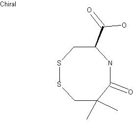 By oxidative cyclization of N-(3-mercapto-2,2-dimethylpropionyl)-L-cysteine (I) by means of I2 in dichloromethane, diethyl bromomalonate and triethylamine in the same solvent.
