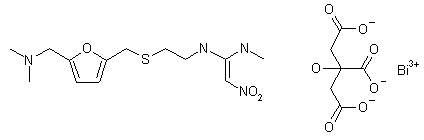The reaction of 2-furan-methanol (I) with dimethylamine and formaldehyde gives 5-(dimethylaminomethyl)furan-2-methanol (II), which is condensed with 2-sulfanylethylamine (III) yielding 2-[5-(dimethylaminomethyl)furan-2-ylsulfanyl]ethylamine (IV). The condensation of (IV) with 1-(methylamino)-1-(methylsulfanyl)-2-nitroethylene (V), obtained from 1,1,-bis(methylsulfanyl)-2-nitroethylene (VI) and methylamine, in hot acetone, or by heating at 100-120 C affords N-[2-[5-(dimethylaminomethyl)furan-2-ylmethylsulfanyl]ethyl]- N'-methyl-2-nitroethylene-1,1-diamine (VII) , which is finally complexed with bismuth (+3) citrate (VIII), obtained by reaction of NO3BiO with citric acid (IX) in hot water.