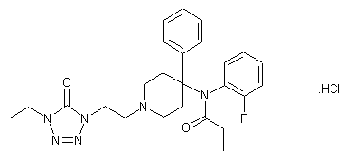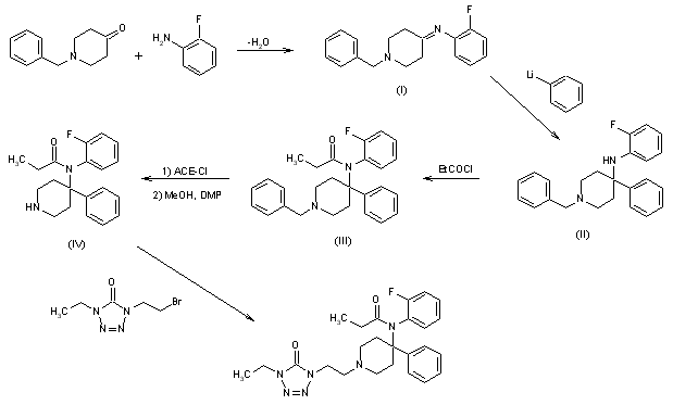 Condensation of 1-benzyl-4-piperidone (I) with 2-fluoroaniline (II) affords imine (III). Addition of phenyllithium (IV) to imine (III) gives amine (V), which is acylated with propionyl chloride and the resultant amide (VI) is debenzylated via 1-chloroethyl chloroformate in refluxing 1,2-dichloroethane followed by methanolysis to give (VII). Amine (VII)) is alkylated with 1-(2-bromoethyl)-4-ethyl-4,5-dihydro-1H-tetrazol-5-one(VIII) to yield A-3665. A-3665 hydrochloride is precipitated with dry HCl gas in ethyl ether.