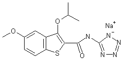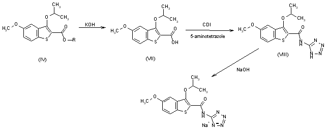 Saponification of ester (IV) yields the alkoxycarboxylic acid (VII), which is coupled with 5-aminotetrazole in the presence of 1,1'-carbonylbis(1H-imidazole) (CDI) to provide the carboxamidotetrazole (VIII). Reaction of (VIII) with sodium hydroxide furnishes CI-959 (IX) as the tetrazole sodium salt.