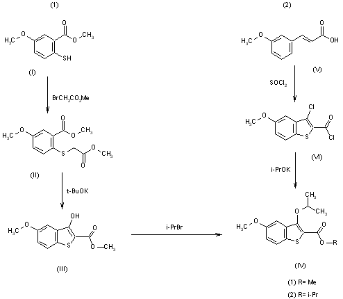 Alternate routes to the key benzo[b]thiophene ester intermediates (IV) are described: 1) Alkylation of the thiol ester (I) yields the diester (II), and a Dieckmann condensation of (II) with base provides the benzo[b]thiophene enol ester (III). Alkylation of (III) with 2-bromopropane then yields the ester intermediate (IV, R = CH3). 2) A shorter route to (IV) begins with cyclization of the cinnamic acid derivative (V) with thionyl choride (2) to give the chloro acid chloride (VI). Reaction of (VI) with the potassium salt of 2-propanol yields the ester (IV, R = CH(CH3)2).