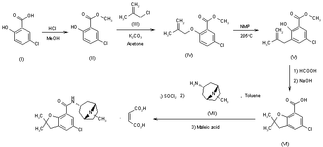 1) The esterification of 5-chloro-2-hydroxybenzoic acid (I) with methanol - HCl gives the corresponding methyl ester (II), which is alkylated with 3-chloro-2-methylpropene (III) to afford methyl 5-chloro-2-(2-methyl-2-propenyloxy)benzoate (IV). The rearrangement of (IV) by heating with N-methylpyrrolidine yields methyl 5-chloro-2-hydroxy-3-(2-methyl-2-propenyl)benzoate (V). The cyclization of (V) in formic acid followed by hydrolysis with NaOH gives 5-chloro-2,2-dimethyl-2,3-dihydrobenzofuran-7-carboxylic acid (VI), which is finally treated with SOCl2, condensed with 3alpha-aminotropane (VII) and treated with maleic acid.