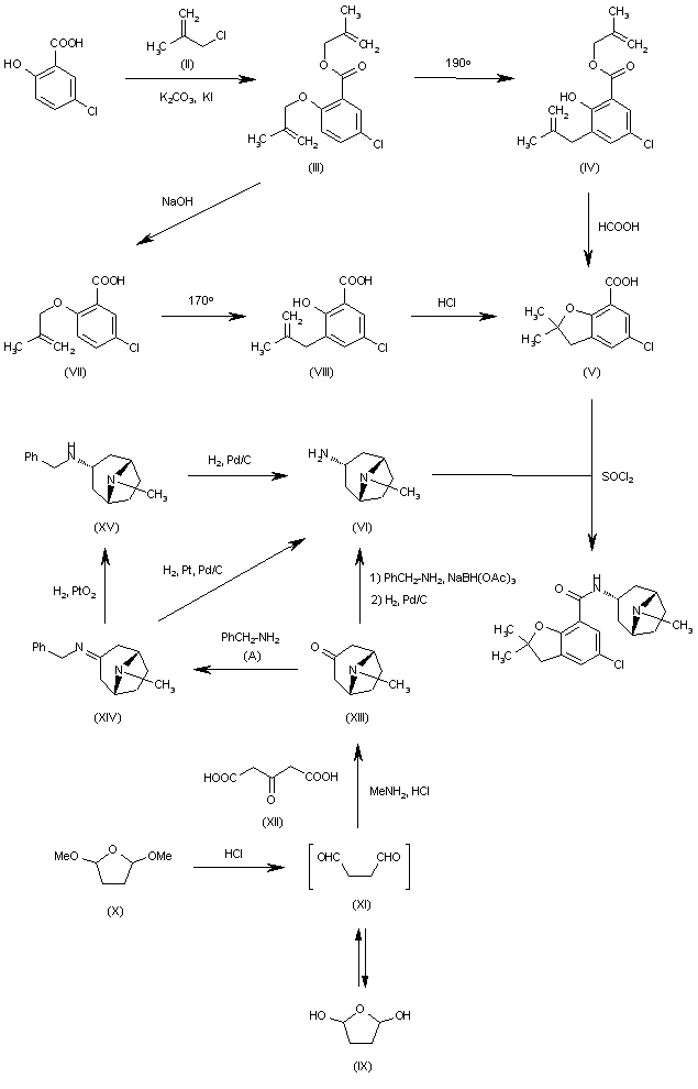 The reaction of 5-chloro-2-hydroxybenzoic acid (I) with 2-methyl-2-propenyl chloride (II) by means of K2CO3 and KI in hot DMF gives 5-chloro-2-(2-methyl-2-propenyloxy)benzoic acid 2-methyl-2-propenyl ester (III), which is rearranged by heating at 190 C yielding 5-chloro-2-hydroxy-3-(2-methyl-2-propenyl)benzoic acid 2-methyl-2-propenyl ester (IV). The cyclization of (IV) with refluxing 90% formic acid affords 5-chloro-2,2-dimethyl-2,3-dihydrobenzofuran-7-carboxylic acid (V), which is treated with SOCl2 in DMF and condensed with endo-8-methyl-8-azabicyclo[3.2.1]octan-3-amine (VI). The acid intermediate (V) can also be obtained by hydrolysis of the ester (III) with NaOH and tetrabutylammonium bisulfate in refluxing water to give 5-chloro-2-(2-methyl-2-propenyloxy)benzoic acid (VII), which is rearranged by heating at 170 C yielding 5-chloro-2-hydroxy-3-(2-methyl-2-propenyl)benzoic acid (VIII). Finally, (VIII) is cyclized to acid intermediate (V) by a treatment with aqueous refluxing 2.7N HCl. The intermediate endo-8-methyl-8-azabicyclo[3.2.1]octan-3-amine (VI) has been obtained as follows: 2,5-dihydroxytetrahydrofuran (IX) or 2,5-dimethoxytetra-hydrofuran (X) with HCl give butanedialdehyde (XI), which, without isolation, is cyclized with 3-oxoglutaric acid (XII) and methylamine by means of NaOAc and HCl in hot water yielding 8-methyl-8-azabicyclo[3.2.1]octan-3-one (XIII). The reductocondensation of (XIII) with benzylamine by means of NaBH(OAc)3, followed by hydrogenolysis with H2 over Pd/C in basic water gives directly the amine (VI). The intermediate amine (VI) can also be obtained by condensation of bicyclooctanone (XIII) with benzylamine(A) to give the imine (XIV), which is reduced to the benzylamine (XV) with H2 over PtO2 in ethanol. Finally, this compound is debenzylated by hydrogenation over Pd/C in the same solvent yielding amine (VI).