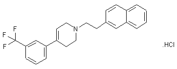 The condensation of 4-[3-(trifluoromethyl)phenyl]-1,2,3,6-tetrahydropyridine (I) with 2-(2-naphthyl)acetyl chloride (II) by means of triethylamine in dichloromethane gives 1-[2-(2-naphthyl)acetyl]-4-[3-(trifluoromethyl)phenyl]-1,2,3,6 tetrahydropyridine (III), which is finally reduced with LiAlH4 in ethyl ether.