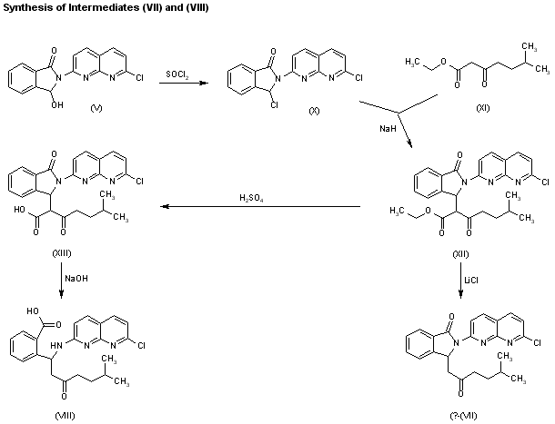 The isoindolinone (VII) (racemic pagoclone) can also be obtained by reaction of isoindolinone (V) with SOCl2 in DMF to provide 3-chloro-2-(7-chloro-1,8-naphthyridin-2-yl)isoindolin-1-one (X), which is condensed with 3-oxo-6-methylheptanoic acid ethyl ester (XI) by means of NaH in DMF to yield 2-[2-(7-chloro-1,8-naphthyridin-2-yl)-3-oxoisoindolin-1-yl-6-methyl-3-oxoheptanoic acid ethyl ester (XII). Finally, this compound is decarboxylated to the indolinone (VII) by means of LiCl in refluxing DMSO/water. The racemic benzoic acid (VIII) can also be obtained by hydrolysis of the heptanoic ester (XII) with concentrated sulfuric acid to give the corresponding free acid (XIII), which is finally decarboxylated and hydrolyzed by means of NaOH in water.