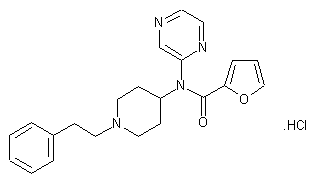 4-Amino-1-phenethylpiperidine (I) is stirred with chloropyrazine (II) and copper powder in phenyl ether at 170-175 C to obtain 1-phenethyl-4-[N-(pyrazinyl)amino]piperidine (III). Subsequent acylation of (III) with 2-furoyl chloride in 1,2-dichloroethane yields mirfentanil as the hydrochloride salt after cooling and filtration. Further purification is achieved by recrystallization from n-propanol.
