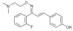 Condensation of 2'-fluoroacetophenone (I) with 4-methoxybenzaldehyde (II) under acidic conditions afforded chalcone (III). This was subsequently demethylated with boron tribromide to yield the 4-hydroxy chalcone (IV). Alternatively, chalcone (IV) was also obtained by condensation of 2'-fluoroacetophenone (I) with 4-hydroxybenzaldehyde (V). Reaction of chalcone (IV) with 2-(dimethylamino)ethoxyamine dihydrochloride (VI) produced the corresponding oxime as a mixture of syn target compound and anti (VIII) isomers. The title syn isomer was isolated by fractional extraction at increasing pH values or, alternatively, by recrystallization as the corresponding hemifumarate salt. Optionally, the undesired anti compound (VIII) was isomerized by acidic treatment to produce a 45:55 mixture of target compound and (VIII).