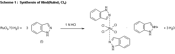 According to the reaction commercially available RuCl3 is purified by refluxing with EtOH and HCl to give a solution of Ru(III), which is then reacted with indazole (Ind) in 1N HCl to give the complex HInd(RuInd2Cl4).