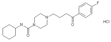 FG5803 is obtained in a three-step synthesis: In the first step 4-(4-fluorophenyl)-4,4-ethylenedioxybutylchloride (A) reacts with piperazine (B) to give 1-[4-(4-fluorophenyl)-4,4-ethylenedioxybutyl]piperazine (I), which is reacted with cyclohexylisocyanate (C) to form 4-[4-(4-fluorophenyl)-4,4-ethylenedioxybutyl]-N-cyclohexyl-1-piperazinecarboxamide (II). The protecting group is removed by HCl in ethanol and the final product is isolated, 4-[4-(4-fluorophenyl)-4-oxobutyl]-N-cyclohexyl-1-piperazinecarboxamide hydrochloride (III).