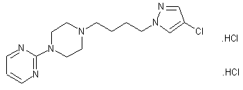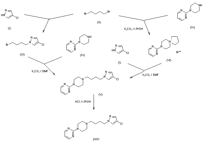 Lesopitron dihydrochloride was obtained following two related procedures. 1) Reaction of 4-chloropyrazole (I) with 1,4-dibromobutane (II) gives 1-(4-bromobutyl)-4-chloropyrazole (III). Compound (III) is refluxed with 2-(1-piperazinyl)pyrimidine (IV) and potassium carbonate in DMF to give lesopitron (V), which is treated with isopropyl alcohol saturated with hydrochloric acid to pH 4.5-5 . 2) 2-(1-Piperazinyl)pyrimidine (IV) reacts with 1,4-dibromobutane (II) to yield 8-(2-pyrimidinyl)-8-aza-5-azoniaspiro[4.5]decane bromide (VI). The quaternary salt (VI) undergoes reaction with 4-chloropyrazole (I) in DMF in the presence of potassium carbonate to afford the free base.