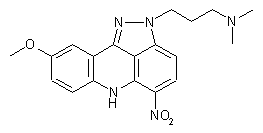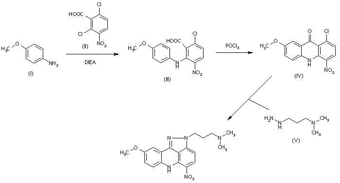 The condensation of 4-methoxyaniline (I) with 2,6-dichloro-3-nitrobenzoic acid (II) by means of DIEA or N,N-dimethylaniline at 75 C gives 6-chloro-2-(4-methoxyphenylamino)-3-nitrobenzoic acid (III), which is cyclized in refluxing POCl3 to yield the acridone (IV). Finally, this compound is condensed with N-[3-(dimethylamino)propyl]hydrazine (V) in THF/methanol to afford the target 2,6-dihydro-pyrazolo[3,4,5-kl]acridine.