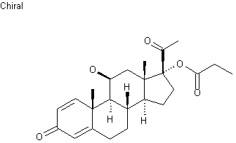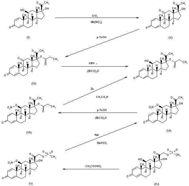 This compound can be obtained by two different ways: 1) The oxidation of 21-desoxyprednisolone (I) with chromium trioxide and manganous nitrate in acetic acid gives 21-desoxyprednisone (II), which is esterified with propionic anhydride and p-toluenesulfonic acid yielding 21-desoxy-17-O-propionylprednisone (III). Finally, this compound is reduced with KBH4 in DMF - water. 2) The esterification of 21-O-(methanesulfonyl)prednisolone (IV) with acetyl nitrate in acetic acid gives 21-O-(methanesulfonyl)-11-O-nitroprednisolone (V), which is treated with NaI and NaHSO3 in acetic acid yielding the corresponding 21-desoxy nitrate ester (VI). The esterification of (VI) with propionic anhydride as before affords 21-desoxy-11-O-nitro-17-O-propionylprednisolone (VII), which is finally denitrated with Zn powder in acetic acid.