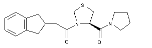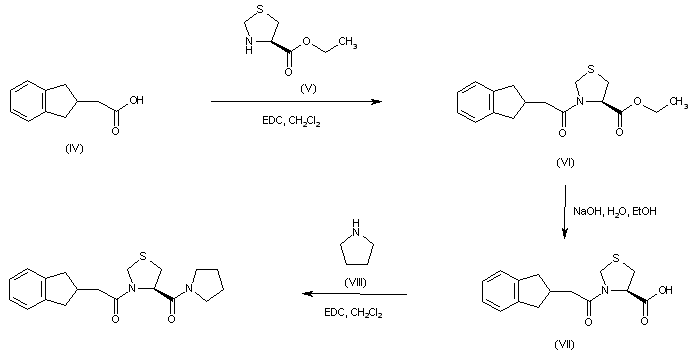 Coupling of indanylacetic acid (IV) with L-thioproline ethyl ester (V) by means of EDC gave amide (VI). Subsequent saponification of the ethyl ester group of (VI) furnished (indanylacetyl)thioproline (VII). The title compound was finally obtained by coupling of acid (VII) with pyrrolidine (VIII).