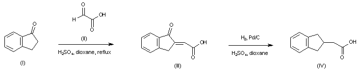 Aldol condensation between 1-indanone (I) and glyoxylic acid (II) in the presence of H2SO4 afforded keto acid (III). Catalytic hydrogenation of (III) over Pd/C furnished 2-indanylacetic acid (IV).