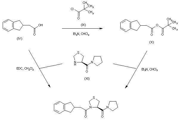 Alternatively, the title compound was prepared by condensation between indanylacetic acid (IV) and thioprolylpyrrolidine (XI) either using EDC as the coupling reagent or via activation as the mixed anhydride (X) with pivaloyl chloride (IX) and triethylamine.