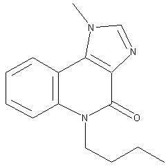 A new synthesis for KF-15570 has been described: The oxidation of 1-methyl-1H-imidazo[4,5-c]quinoline (I) with H2O2 in hot acetic acid gives 4-hydroxy-1-methyl-1H-imidazo[4,5-c]quinoline (II), which is then alkylated with butyl iodide and NaH in hot DMF. Compound was much more potent than theophylline in inhibiting Schulz-Dale reaction-induced tracheal contractions (ID50 = 0.25 mcM) and showed similar acute toxicity in mice (minimal lethal dose > 300 mg/kg i.v.). It was more effective than aminophylline in inhibiting antigen-induced bronchoconstriction in anesthetized guinea pigs (ED50 = 0.42 mg/kg i.v.), but showed fewer cardiac and CNS side effects than theophylline.