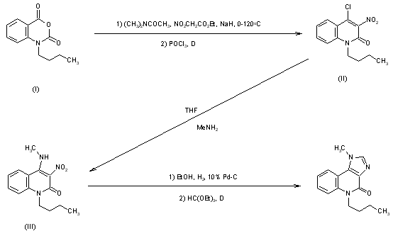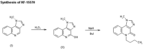 KF15570 is prepared as follows: 1-Butylisatoic anhydride (I) (3) was reacted with anion of ethylnitroacetate to give 1-butyl-4-hydroxy-3-nitroquinolin-2(1H)-one. Without purification, the hydroxy group was chlorinated with phosphorus oxychloride under reflux to give (II). The chlorine in (II) was readily replaced by methyl amino group in THF to provide (III). Hydrogenation of the nitro group in (III), followed by cyclization in refluxing triethylorthoformate, afforded KF15570 (IV).