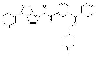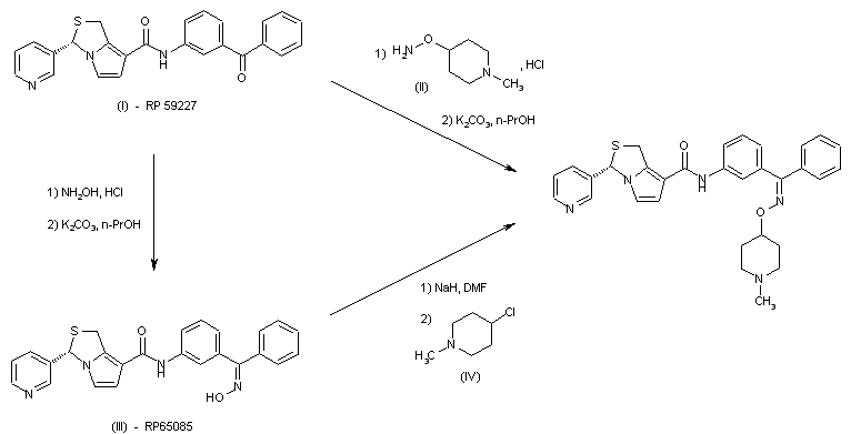 This compound has been obtained by two similar ways: 1. By condensation of the benzophenone derivative (I) with O-(1-methylpiperidin-4-yl)hydroxylamine by means of K2CO3 in propanol. 2. The reaction of benzophenone derivative (I) with hydroxylamine by means of K2CO3 in propanol gives the corresponding oxime (III), which is finally alkylated with 4-chloro-1-methylpiperidine (IV) by means of NaH in DMF.