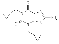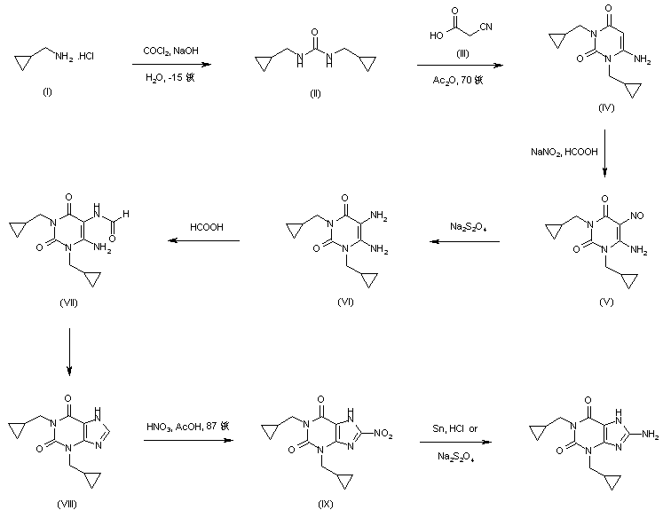 N,N'-Bis(cyclopropylmethyl)urea (II) was prepared by the action of phosgene on cyclopropylmethylamine (I). Cyclization of urea (II) with cyanoacetic acid (III) in hot acetic anhydride produced the 6-aminouracil (IV). Subsequent nitrosation of (IV) by means of sodium nitrite and formic acid afforded the 5-nitroso derivative (V), which was further reduced to the 5,6-diaminouracil (VI) with sodium dithionite. Formylation of diamine (VI), followed by cyclization of the intermediate formamide (VII), gave rise to 1,3-bis(cyclopropylmethyl)xanthine (VIII). Nitration of xanthine (VIII) with HNO3 in acetic acid yielded the 8-nitro derivative (IX), which was finally reduced to the corresponding amine employing either tin and HCl or sodium dithionite.