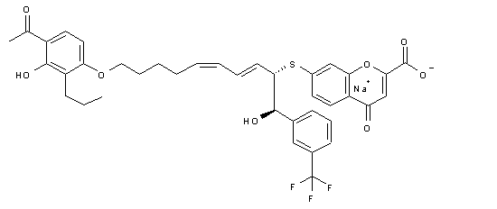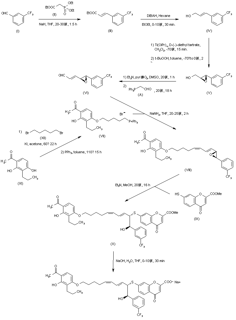 The condensation of 3-(trifluoromethyl)benzaldehyde (I) with phosphonate (II) by means of NaH in THF gives the unsaturated ester (III), which is reduced with DIBAL in ethyl ether / hexane, yielding 3-[3-(trifluoromethyl)phenyl]allyl alcohol (IV). The Sharpless asymmetric epoxidation of (IV) affords the epoxyalcohol (V), which is oxidized with pyridine稴O3 to the corresponding aldehyde and condensed with phosphorane (A) to provide the unsaturated epoxyaldehyde (VI). The condensation of aldehyde (VI) with the pentylphosphonium derivative (VII) by means of NaNH2 in THF gives the corresponding adduct (VIII). The addition of 4-oxo-7-sulfanyl-4H-1-benzopyran-2-carboxylic acid methyl ester (IX) to the epoxide group of (VIII) by means of Et3N in methanol yields the expected alpha-hydroxy thioether (X), which is finally hydrolyzed with NaOH in THF/water to afford the target sodium salt. The intermediate pentylphosphonium derivative (VII) has been obtained by selective alkylation of 2,4-dihydroxy-3-propylacetophenone (XI) with 1,5-dibromopentane (XII) followed by reaction of the resulting ether with triphenylphosphine in refluxing toluene.