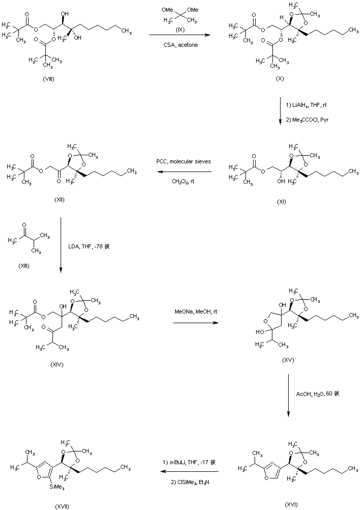 The resulting diol (VIII) was converted to the isopropylidene ketal (X) by means of dimethoxypropane (IX) and camphorsulfonic acid. Both pivaloyl groups of (X) were reductively removed with LiAlH4, and then selective protection of the primary hydroxyl group gave monopivalate (XI). The secondary hydroxyl group of (XI) was further oxidized to ketone (XII) with PCC. Aldol condensation of (XII) with 3-methyl-2-butanone (XIII) in the presence of LDA afforded (XIV) as a 3:7 diastereomeric mixture. Hydrolysis of pivalate ester of (XIV) with NaOMe was accompanied by intramolecular cyclization to the tetrahydrofuran (XV). This unstable intermediate was dehydrated with warm aqueous AcOH to produce furan (XVI) along with a minor amount of the ketal-hydrolyzed analogue. A trimethylsilyl group was introduced at position 5 of the furan ring of (XVI) through lithiation with n-BuLi, followed by treatment with trimethylsilyl chloride yielding (XVII).