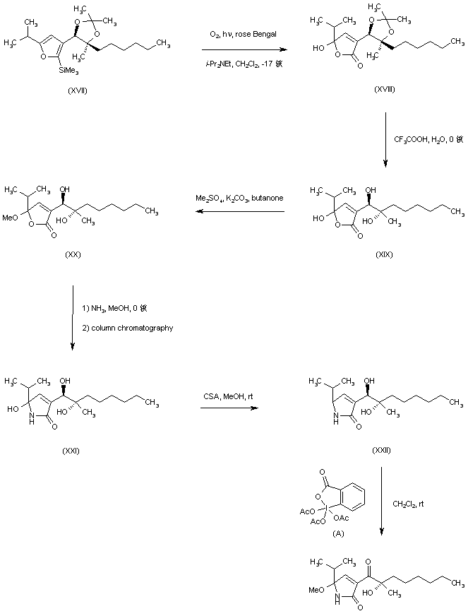 Photochemical singlet oxygen addition to the silyl furan (XVII) in the presence of the sensitizer rose Bengal under irradiation of a mercury lamp afforded lactone (XVIII). The isopropylidene ketal of (XVIII) was then hydrolyzed to give glycol (XIX). Methyl acetalization of the hemiacetal hydroxyl group of (XIX) with dimethyl sulfate under basic conditions provided (XX). This was treated with liquid ammonia in MeOH to obtain the desired gamma-lactam (XXI) together with a small amount of lactone (XIX) that was separated by column chromatography. Methyl acetal reintroduction in (XXI) with MeOH in the presence of camphorsulfonic acid gave (XXII). Finally, oxidation of the secondary hydroxyl of (XXII) group with Dess-Martin periodinane furnished the title compound, existing as a 1:1 mixture of diastereomeric acetals.