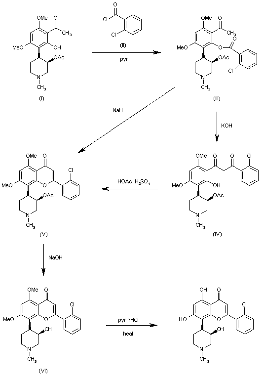 The condensation of acetophenone (I) with 2-chlorobenzoyl chloride (II) in pyridine gives the corresponding ester (III), which is treated with KOH in hot pyridine yielding the diketone (IV). The cyclization of (IV) with H2SO4 in acetic acid at 100 C affords the benzopyranone (V). The hydrolysis of the acetate group of (V) with NaOH in methanol/water affords the piperidinol (VI), which is finally demethylated with pyridinium hydrochloride at 210-20 C. Alternatively, the ester (III) can be cyclized directly to benzopyranone (V) by means of NaH in hot dioxane.