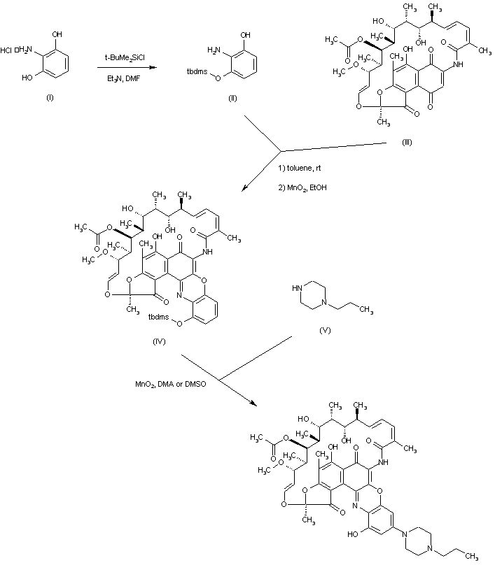 The mono-silylation of 2-aminoresorcinol (I) by means of tert-butyldimethylsilyl chloride and triethylamine yields silyl ether (II). Condensation of rifamycin S (III) with aminophenol (II), followed by oxidative treatment with MnO2 produces the benzoxazinorifamycin derivative (IV). Addition of N-propyl piperazine (V) to (IV) in the presence of MnO2 leads to the target piperazinyl benzoxazinorifamycin.